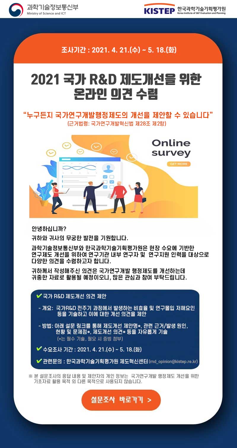 - [일반공지] [한국과학기술기획평가원] 국가 R&D 제도개선 의견수렴 참여 협조 요청
