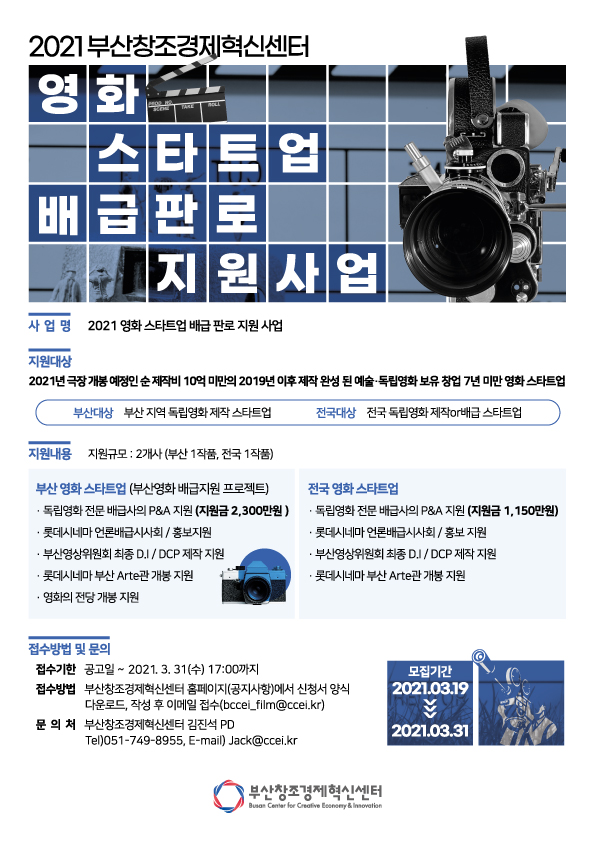 - [부산창조경제혁신센터] 부산창조경제혁신센터 2021 영화 스타트업 배급 판로 지원사업 모집 안내